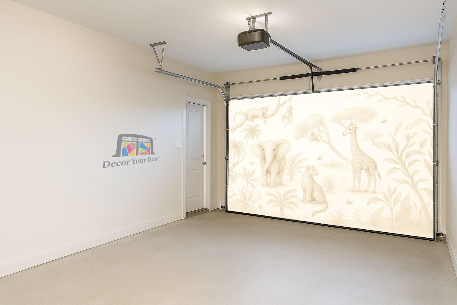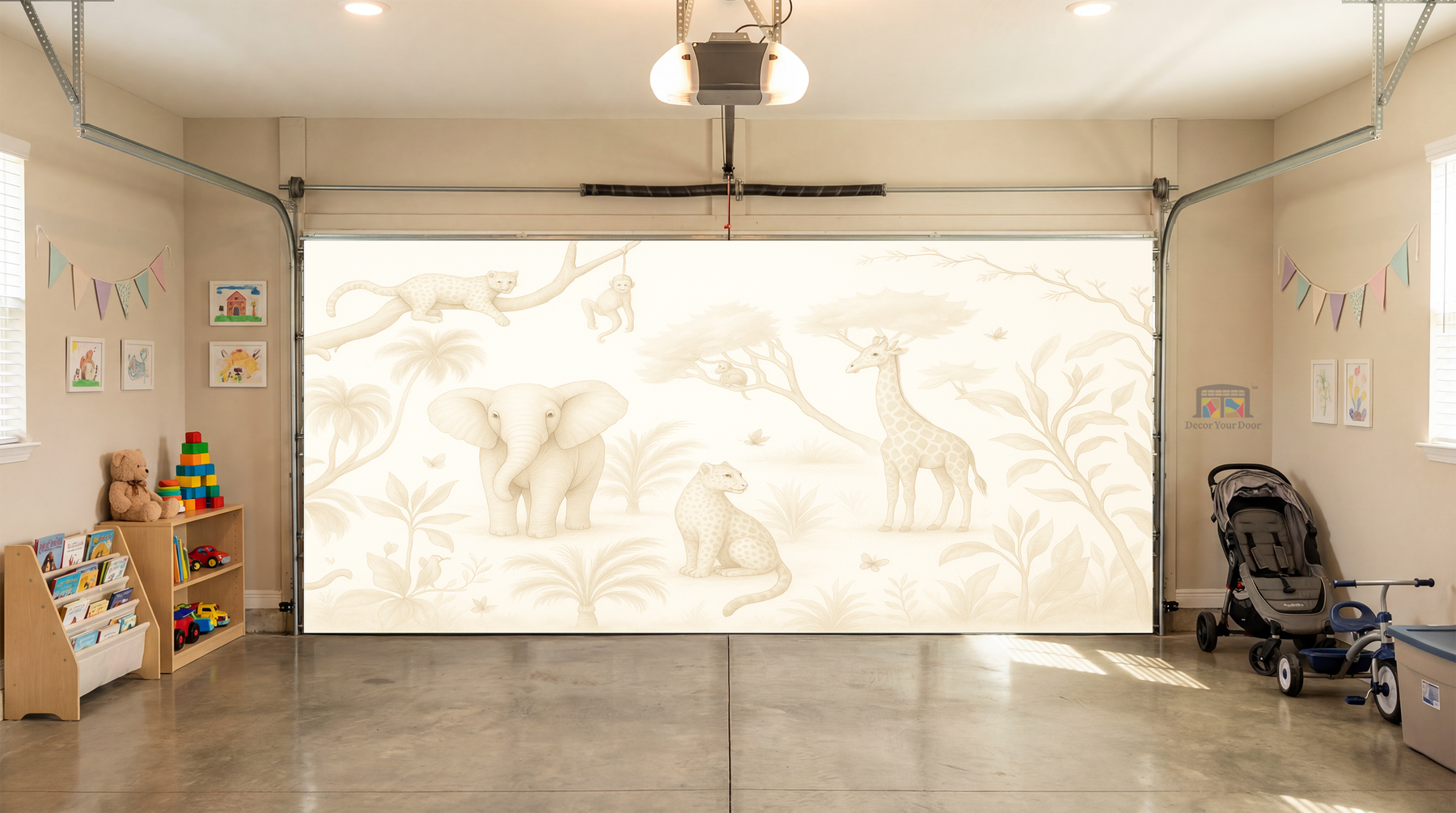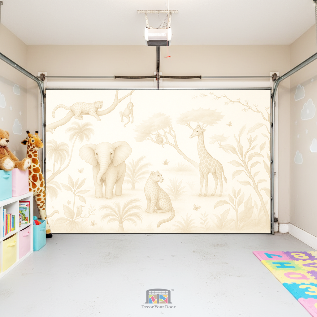Bring soft safari charm into your home with the Safari Daydream cover by Decor Your Door. This sepia-toned wildlife mural creates a peaceful atmosphere, perfect for nurseries, play areas, and cozy family spaces. Designed to blend naturally with any décor, it turns your garage interior into a warm and welcoming environment with a premium finish.