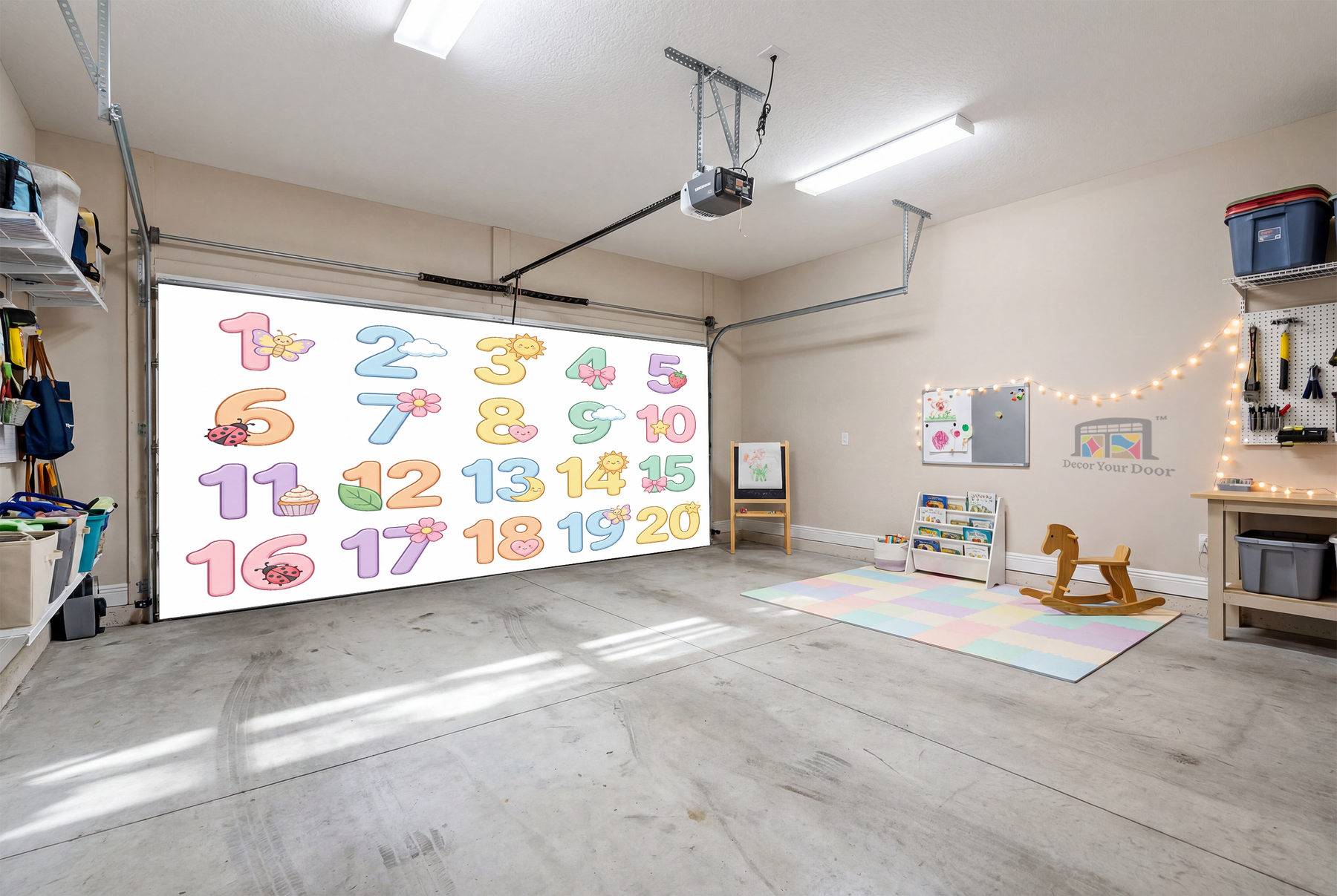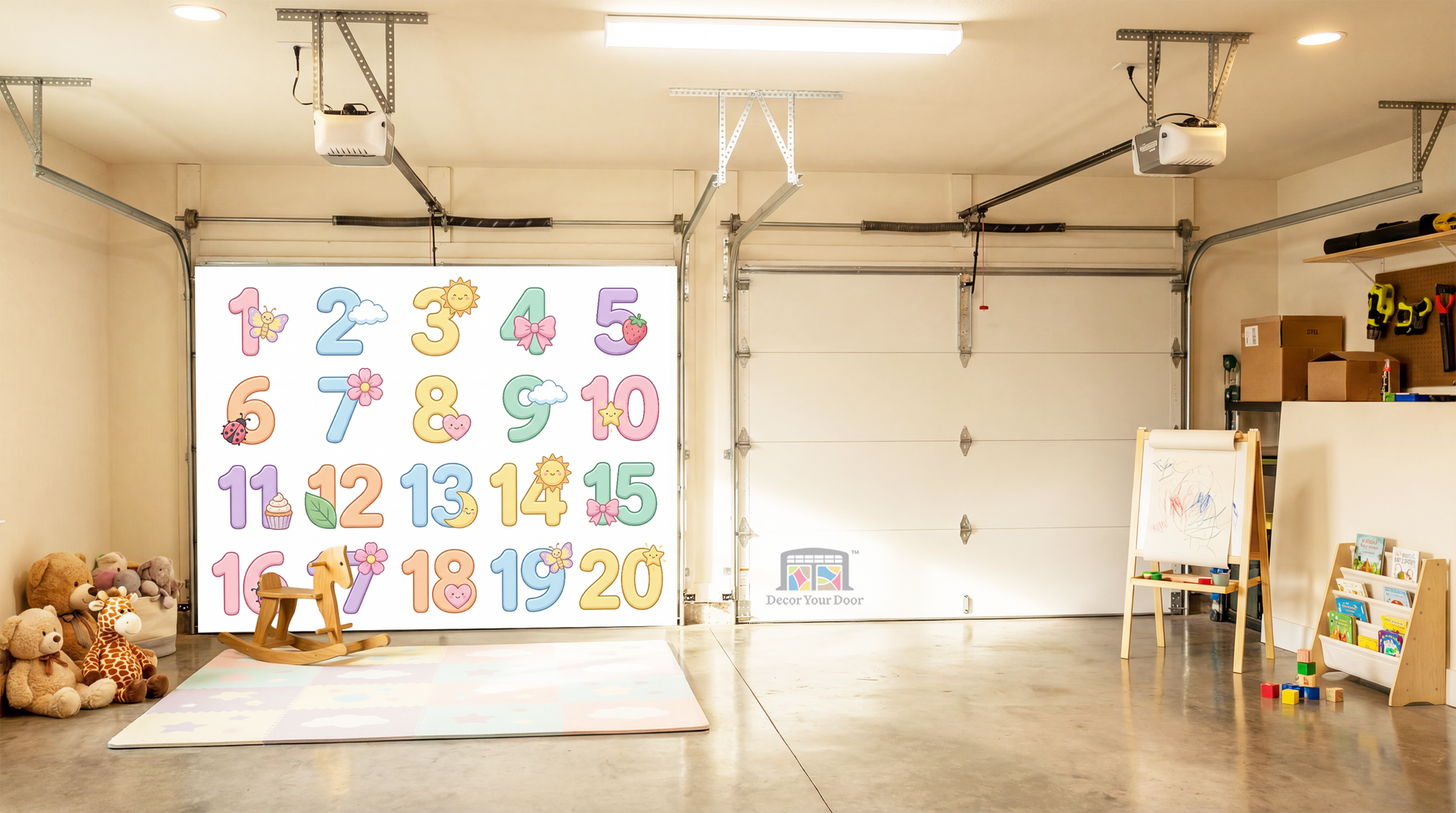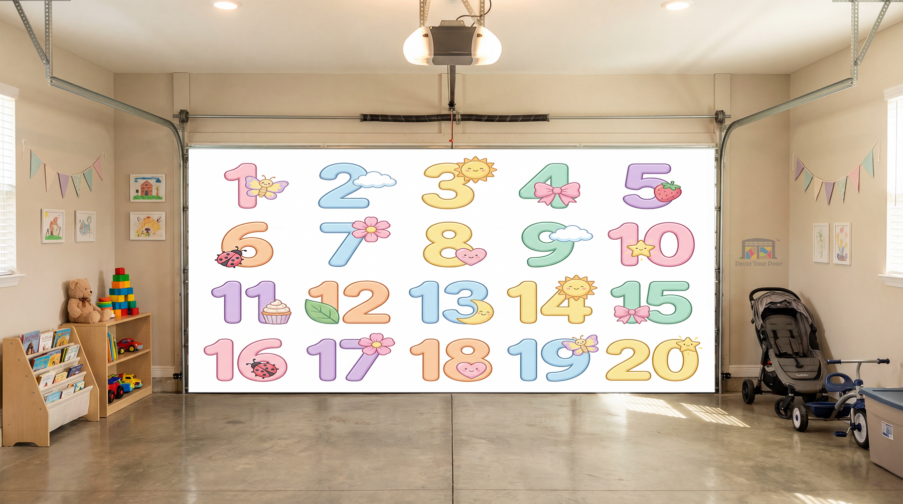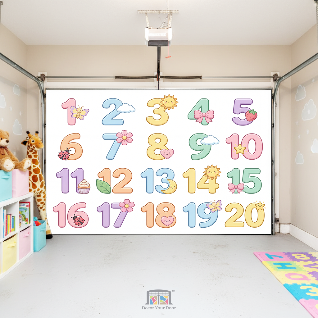 Turn your garage into a soft and joyful learning space with this Sweet Numbers 1–20 Learning Interior Garage Door Cover by Decor Your Door. Designed in gentle pastel tones with cute, friendly illustrations, this cover helps little ones learn counting in a calm and engaging way. Each number from 1 to 20 is clearly displayed alongside matching objects, making it easy for kids to recognize numbers and understand quantity. The soothing colors and clean layout create a peaceful atmosphere that feels perfect for nurseries, playrooms, and family spaces, while transforming the garage into a fun and calming learning area with a polished decorative touch.