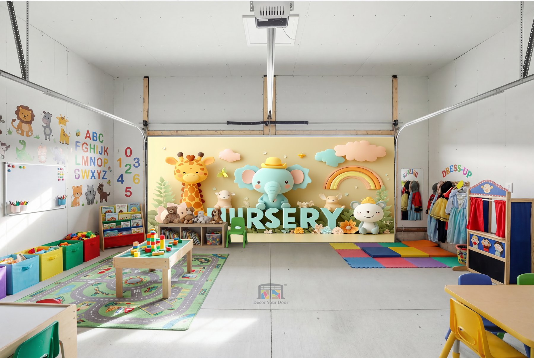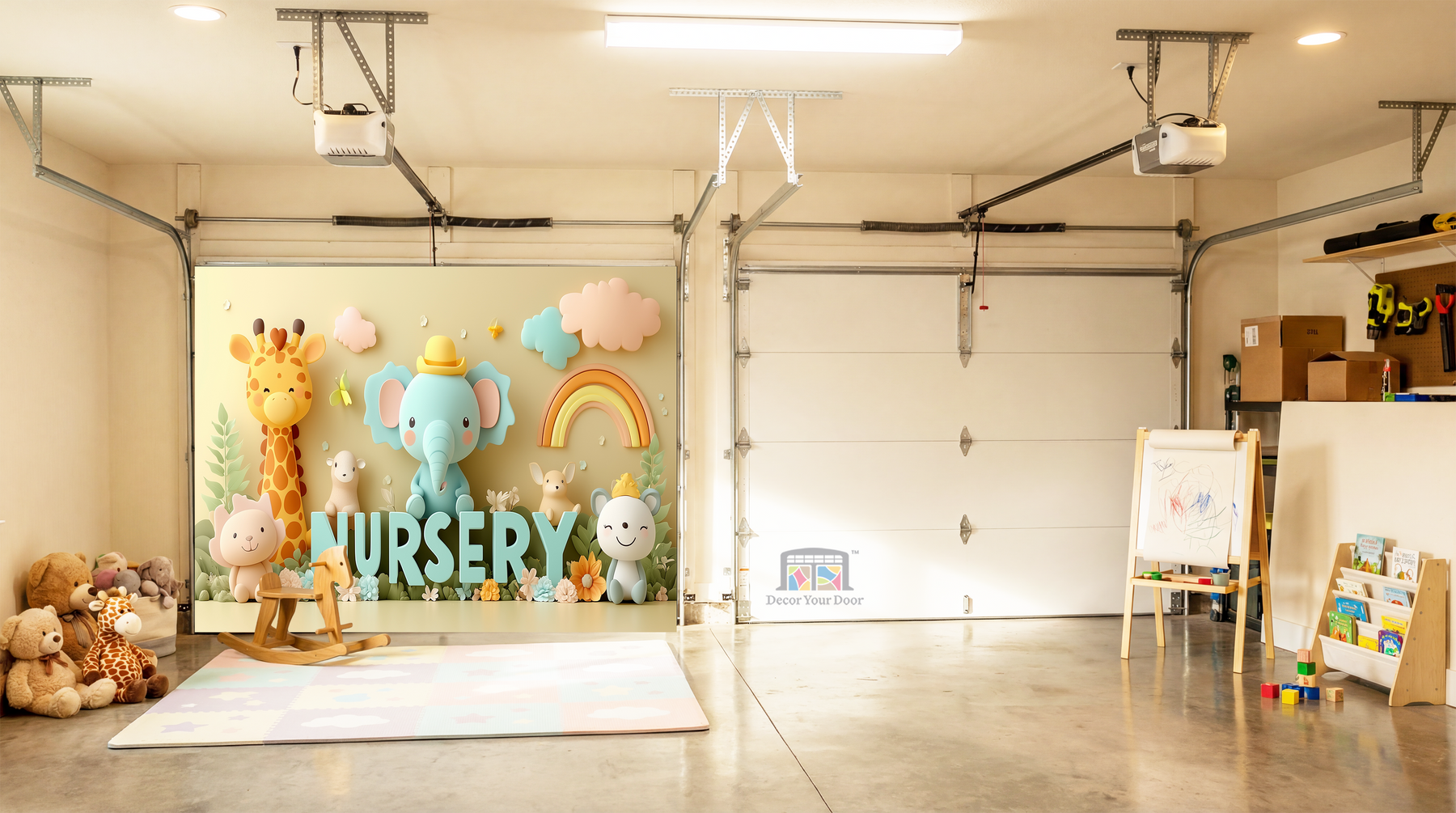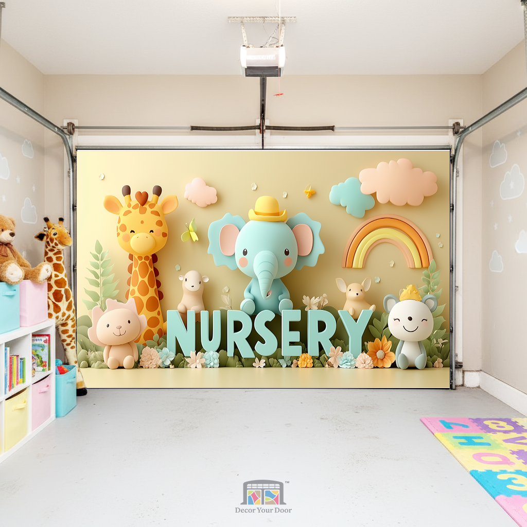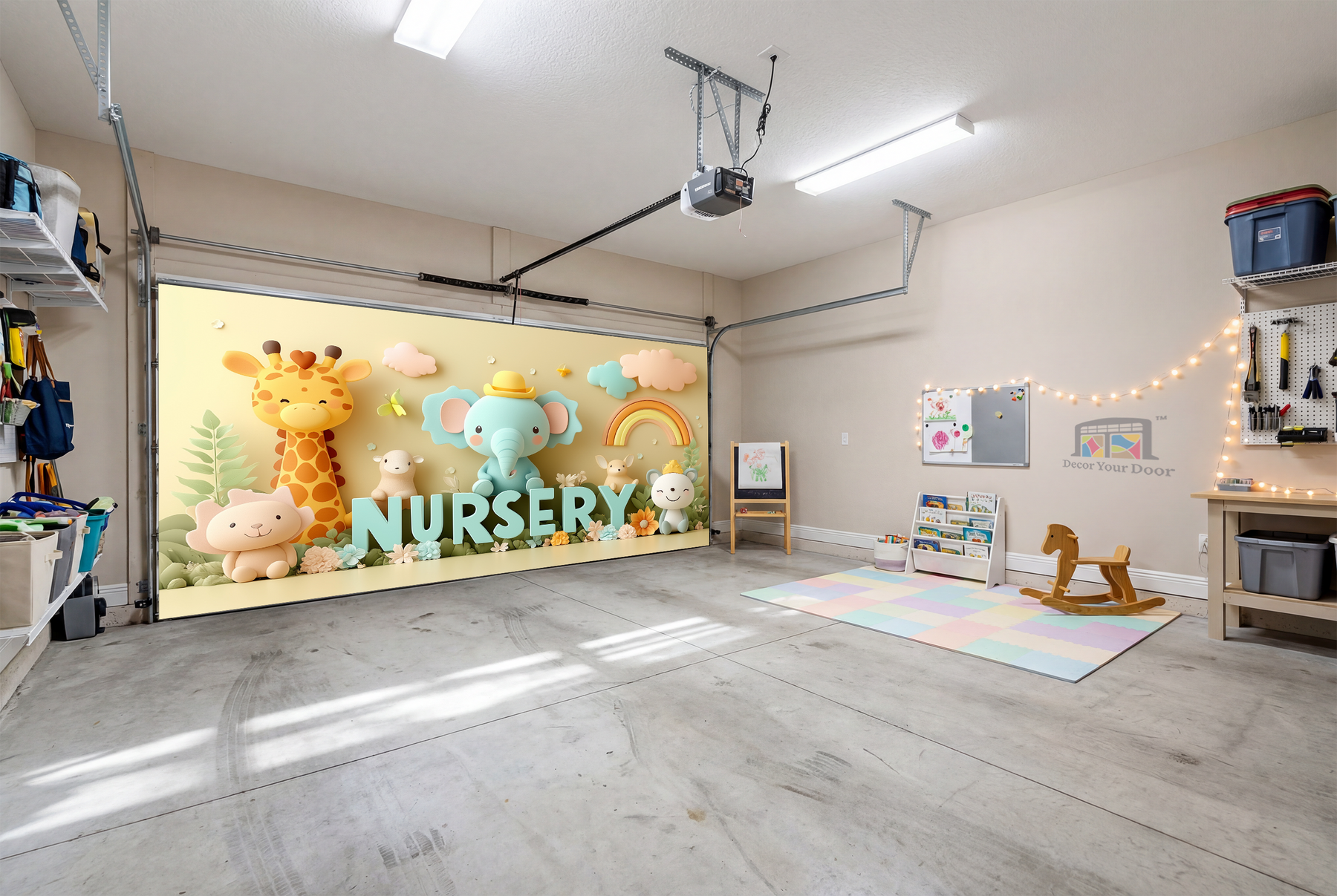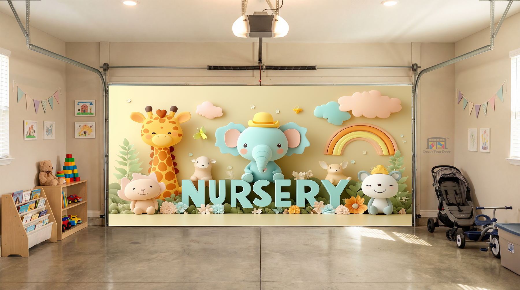The Sweet Safari Friends – Interior Garage Door Cover brings a gentle, storybook charm to your nursery with adorable safari animals, soft pastel colors, and playful details like rainbows, clouds, and butterflies. Featuring a friendly elephant, cheerful giraffe, and cuddly animal companions, this design creates a warm, happy atmosphere that feels comforting and joyful for little ones. The soothing color palette and rounded shapes make the space feel calm, safe, and full of imagination. A perfect way to transform your garage into an extension of your nursery’s cozy world, lovingly designed by Decor Your Door.