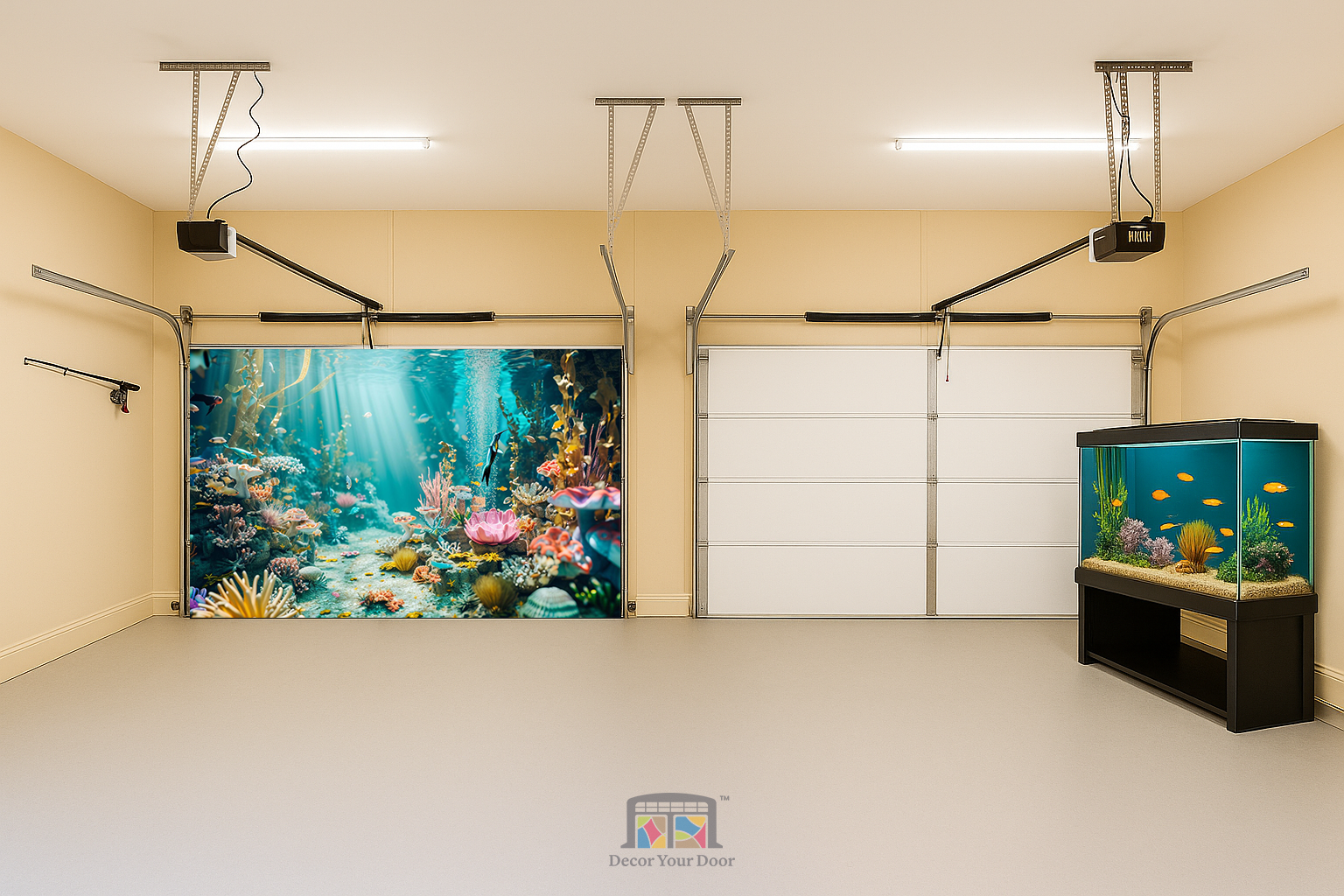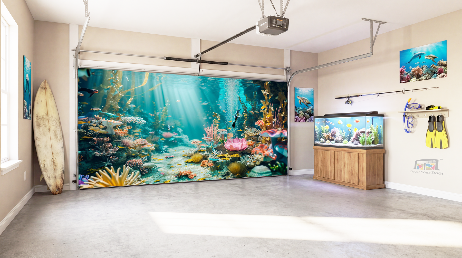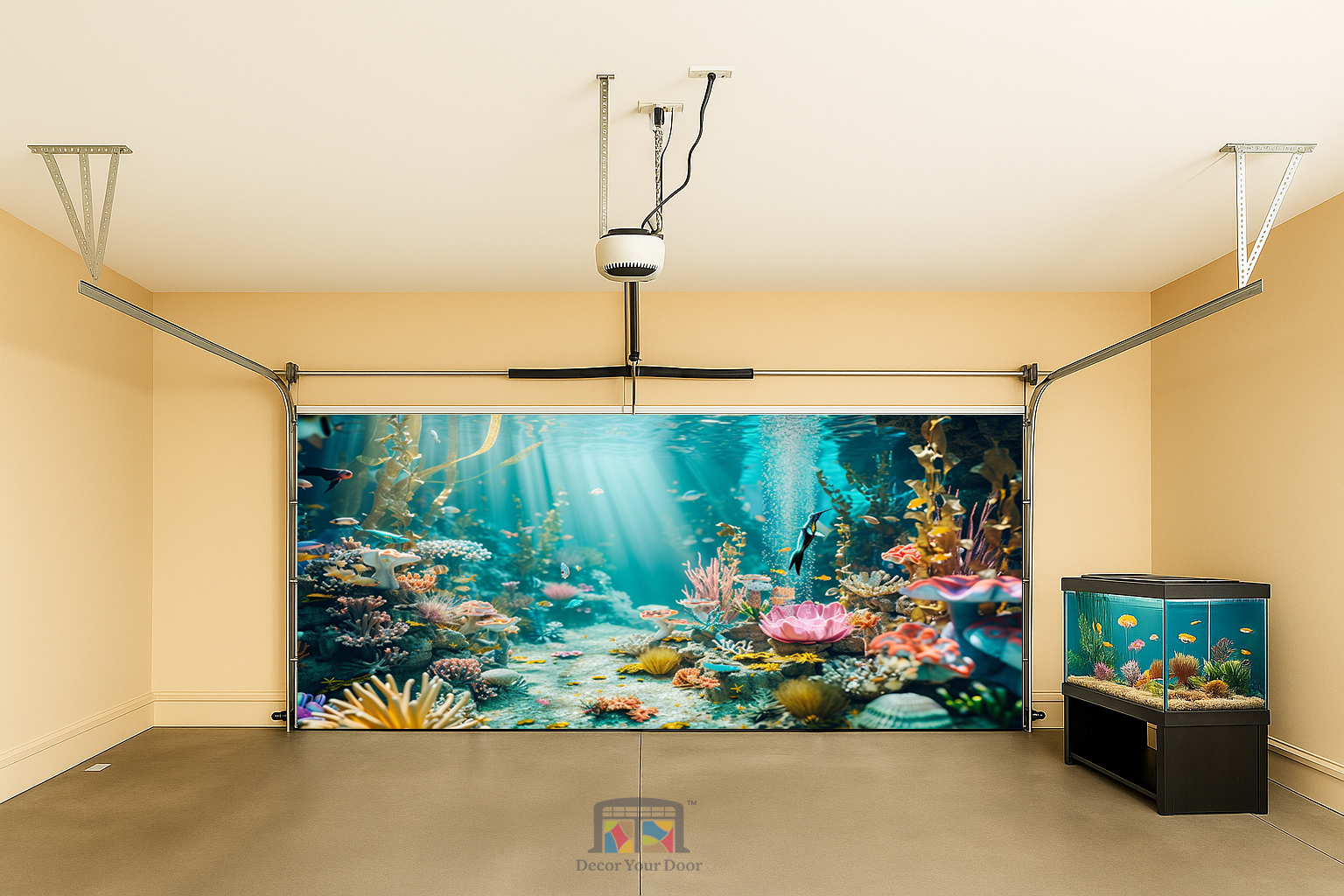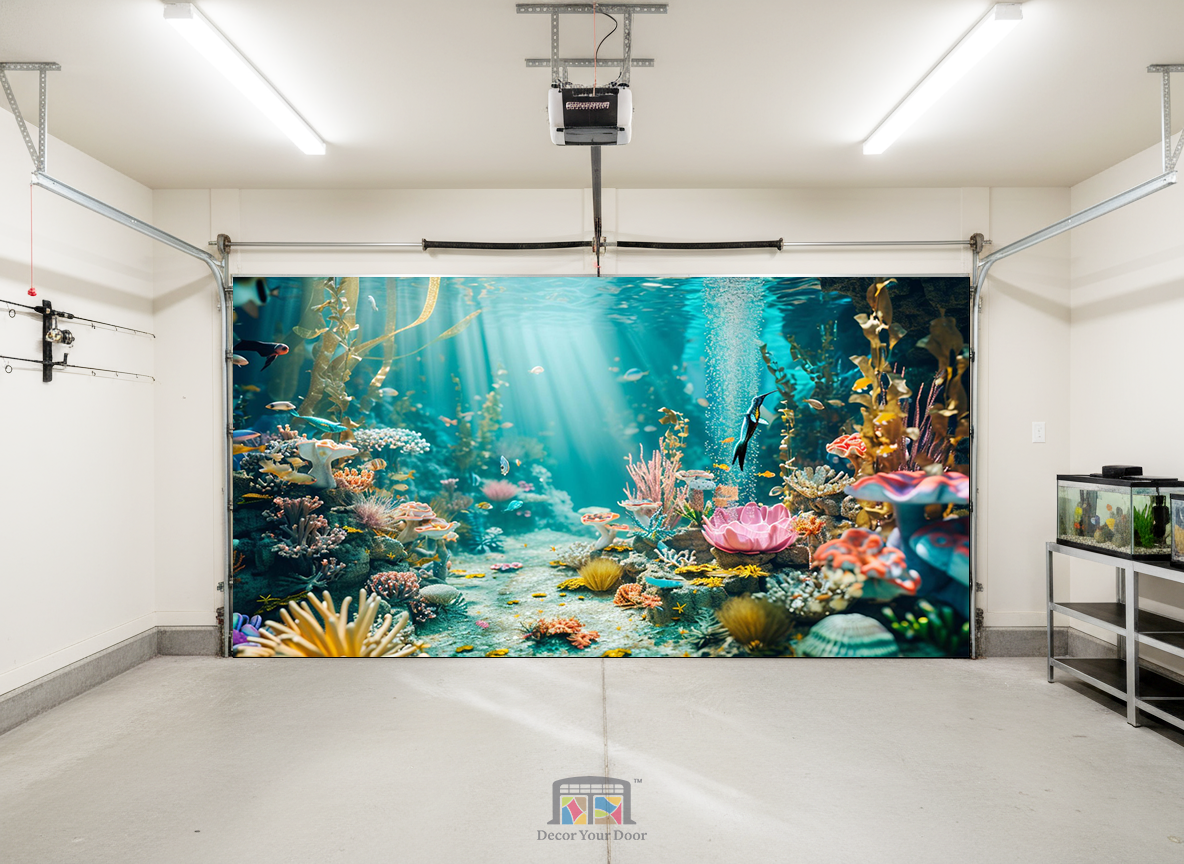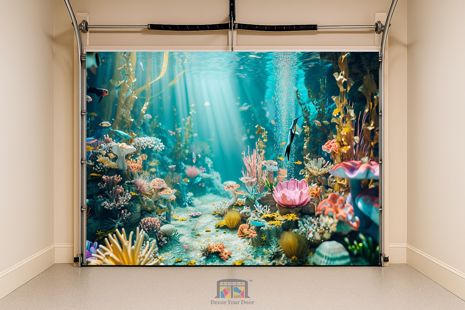 Fill your garage with soft morning light beneath the sea. This design captures a peaceful underwater scene where sunbeams break through the surface and light up vibrant coral gardens and graceful sea life. The atmosphere feels fresh, clear, and full of life waking up for a new day.