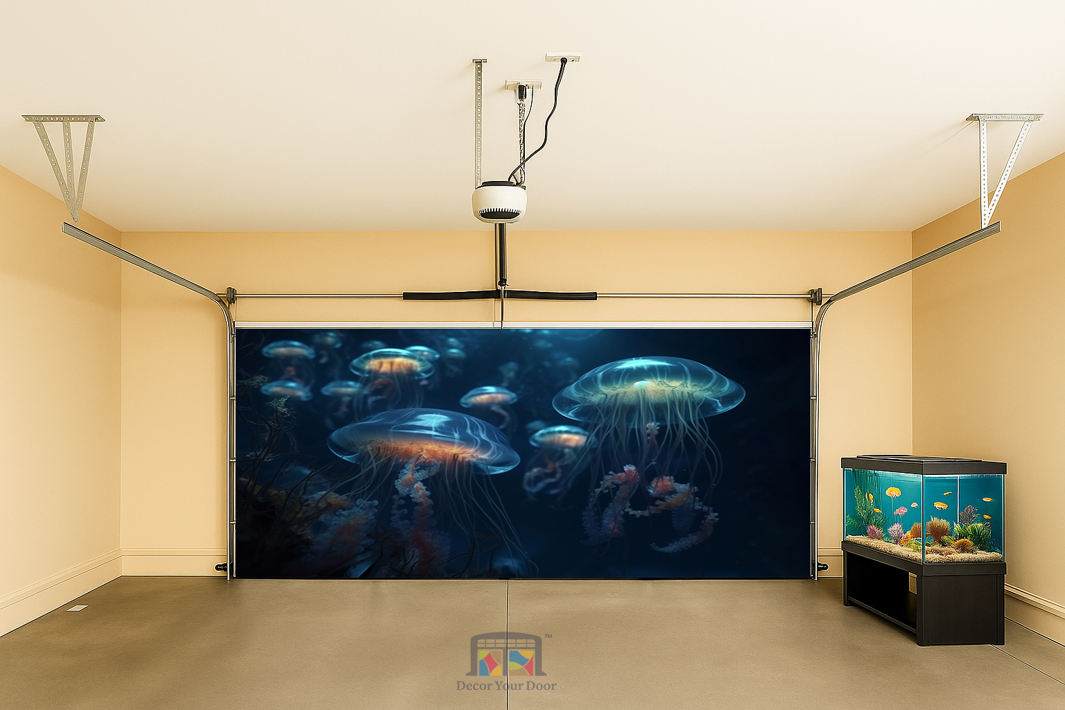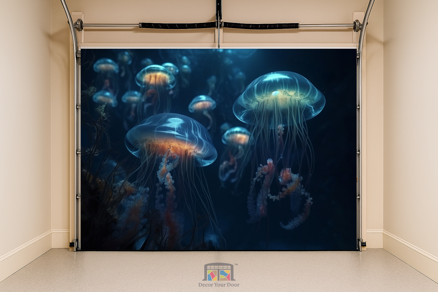 Let your garage feel like it’s floating through the deep ocean. This design captures glowing jellyfish moving slowly through dark blue waters, creating a calm and hypnotic underwater atmosphere. The lighting feels real and natural, almost like an aquarium at night.