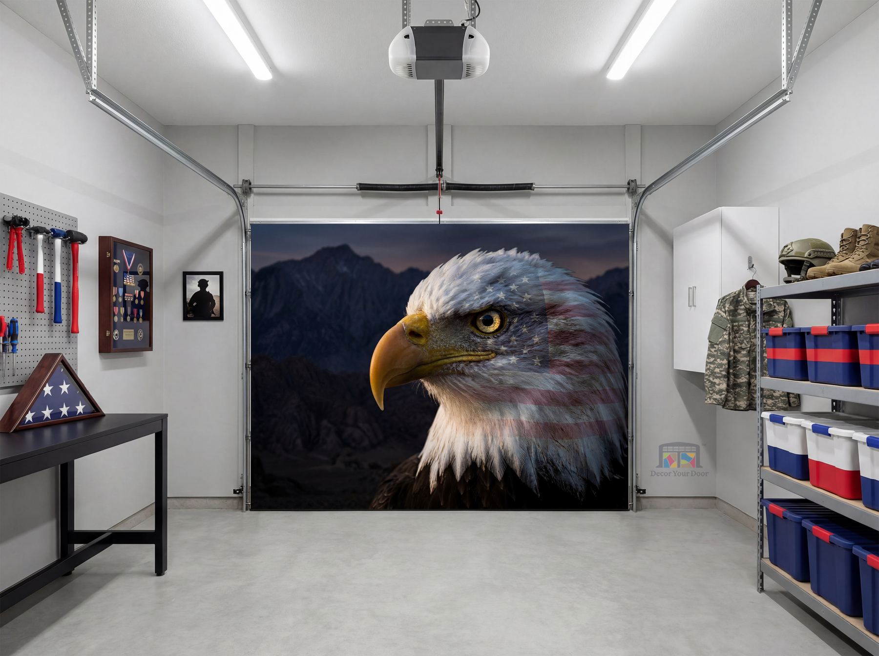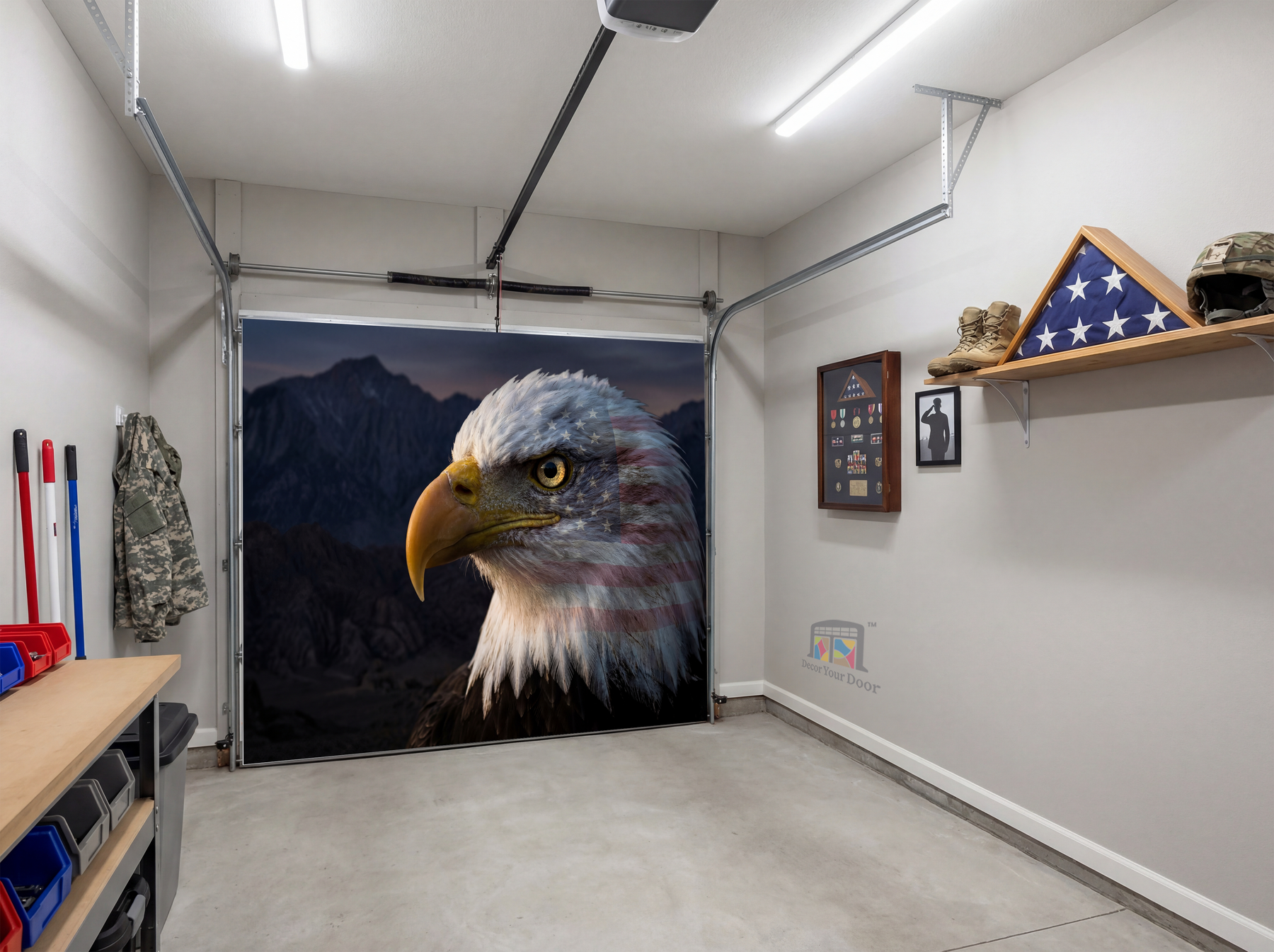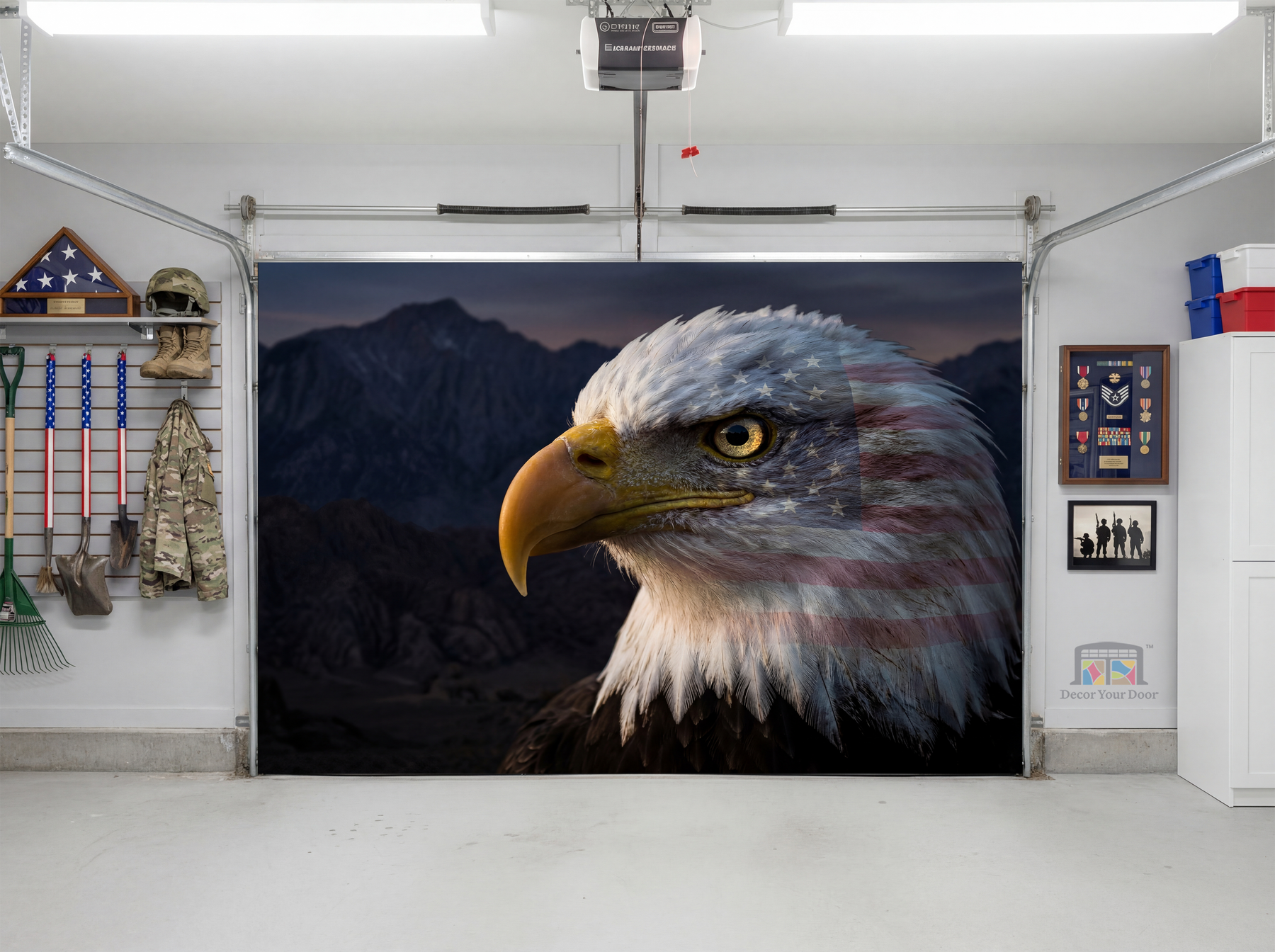 A powerful close-up of a bald eagle layered with the American flag, symbolizing strength, freedom, and pride. This bold design makes a statement the moment you enter your garage, delivering a patriotic atmosphere that feels strong, timeless, and inspiring. Designed by Decor Your Door.
