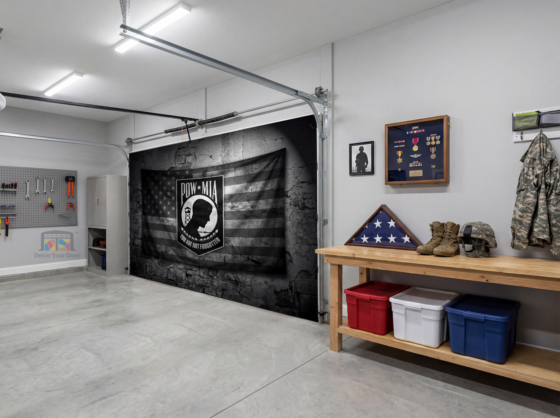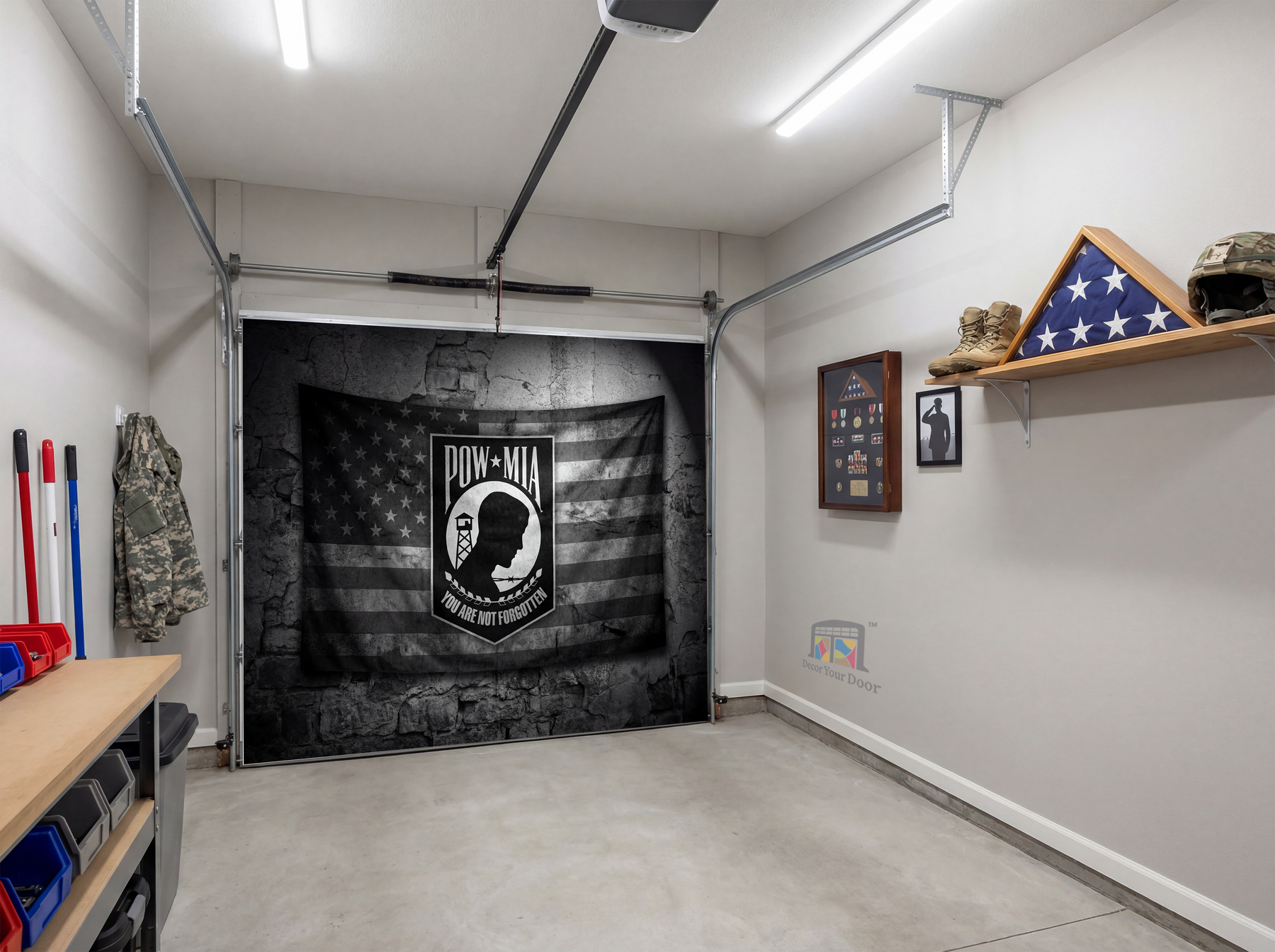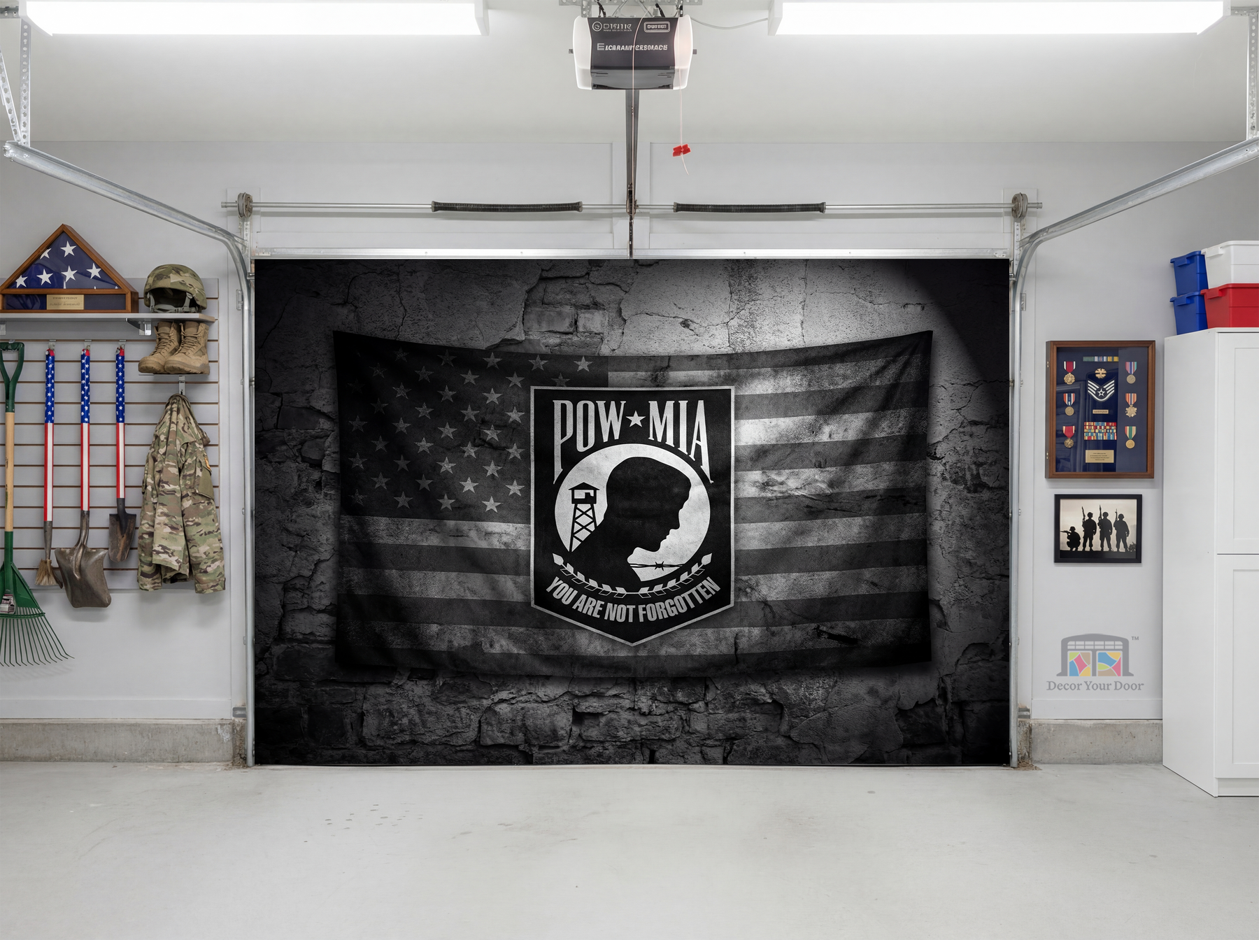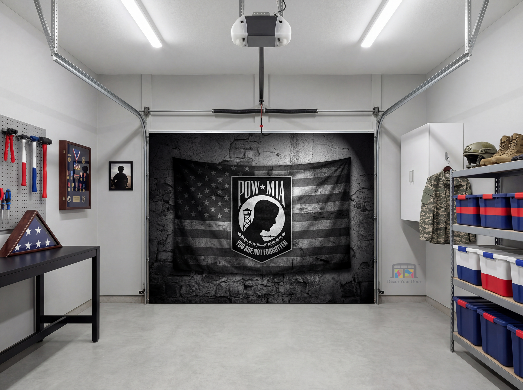 A solemn and powerful POW MIA memorial design honoring those who were prisoners of war or missing in action. With a black-and-white patriotic flag backdrop, this piece stands as a reminder that they are never forgotten. A meaningful tribute by Decor Your Door.