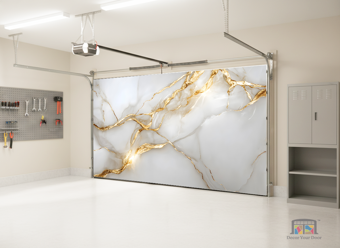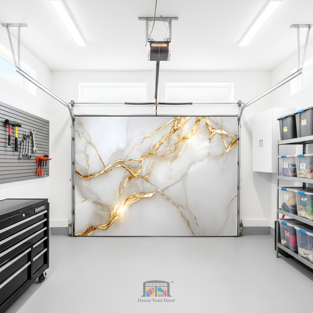 Elevate your garage with the luxurious look of marble and gold. Marble Gold Veins by Decor Your Door features soft white stone texture highlighted with rich metallic accents, creating a bright and elegant aesthetic. Ultra realistic and modern, it transforms any garage into a stylish, high end space without renovation. Easy to install and stunning in any setting, this design delivers pure sophistication.