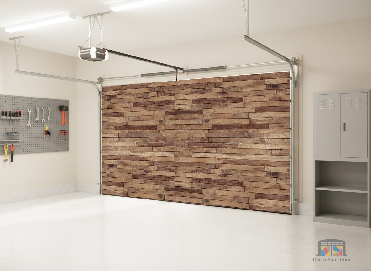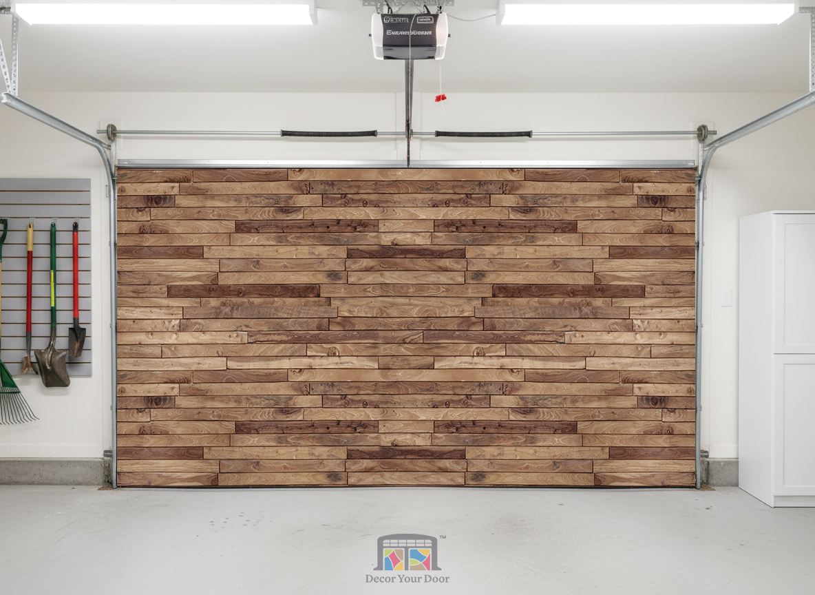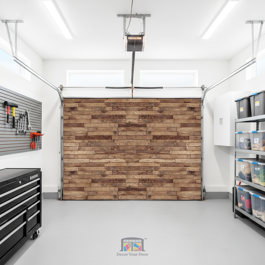 Bring warmth and natural charm into your garage with the Rustic Wood Plank Wall cover by Decor Your Door. This ultra realistic wood texture blends rich tones and natural grain patterns to create the look of handcrafted wooden paneling. It adds depth, coziness, and a stylish rustic feel without any construction work. Easy to install and visually impressive, it is the perfect upgrade for a warm, inviting atmosphere.