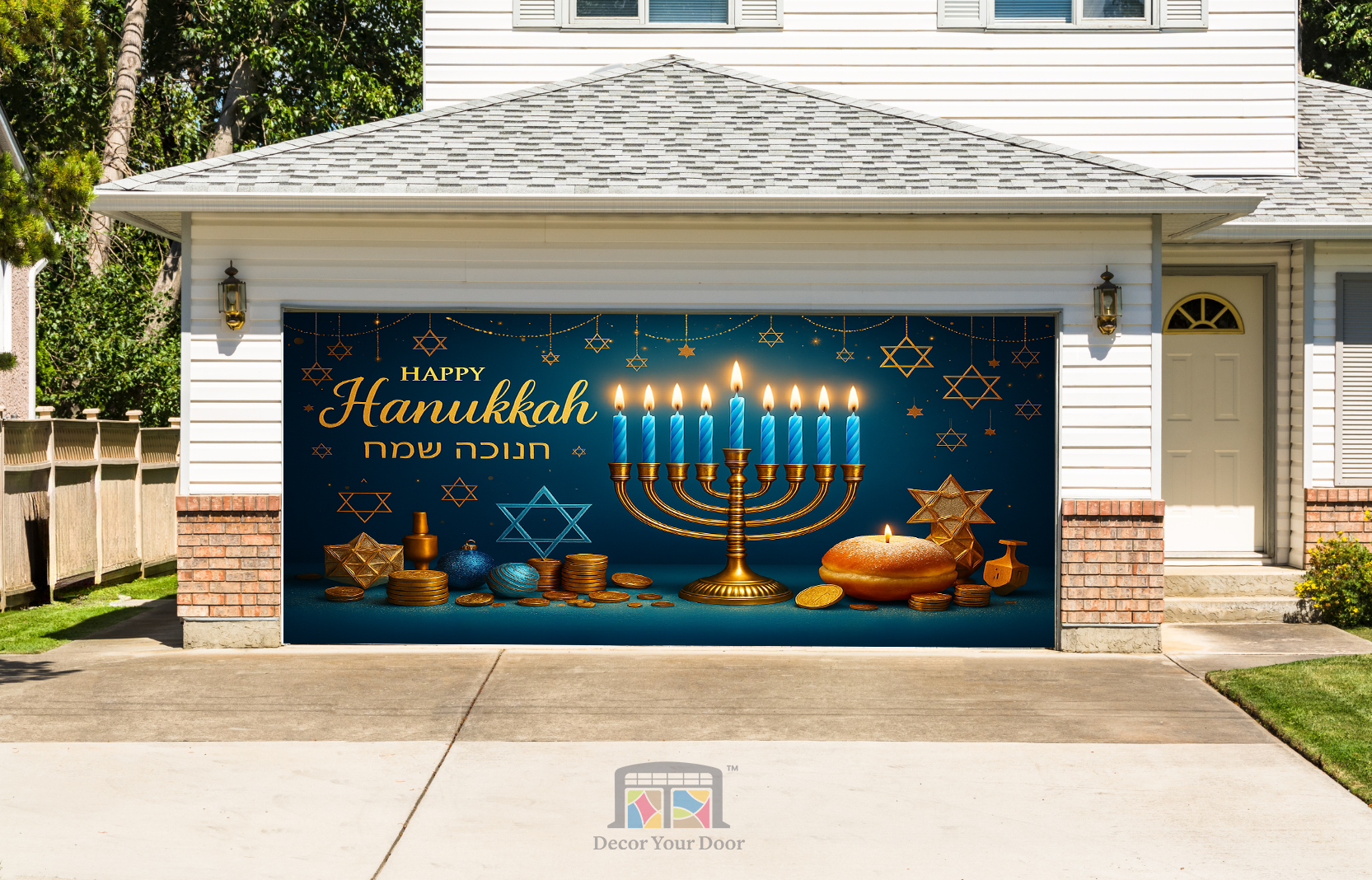 Celebrate the joy and warmth of Hanukkah with this stunning Festival of Lights garage door cover from Decor Your Door. Featuring a majestic golden menorah glowing with nine bright candles, shimmering Star of David decorations, chocolate gelt, dreidels, and traditional sufganiyot, this design captures the heart of the holiday in a vivid and elegant scene.