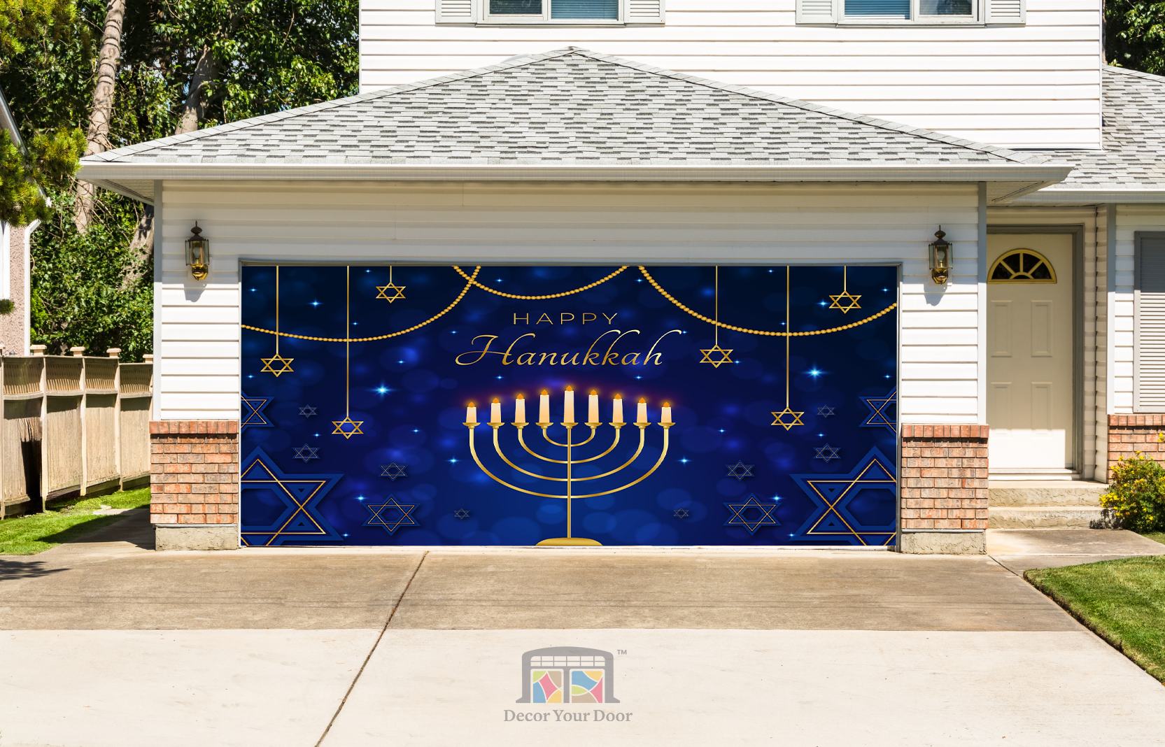 Bring timeless elegance to your home this holiday season with the Decor Your Door Golden Glow Hanukkah design. This beautiful artwork features a radiant gold menorah, soft candlelight, and shimmering Stars of David set against a rich midnight blue background. The glowing details and festive hanging garlands create a warm and uplifting atmosphere that celebrates the joy and light of Hanukkah. A stunning way to transform your garage door and welcome family, friends, and neighbors with holiday spirit.