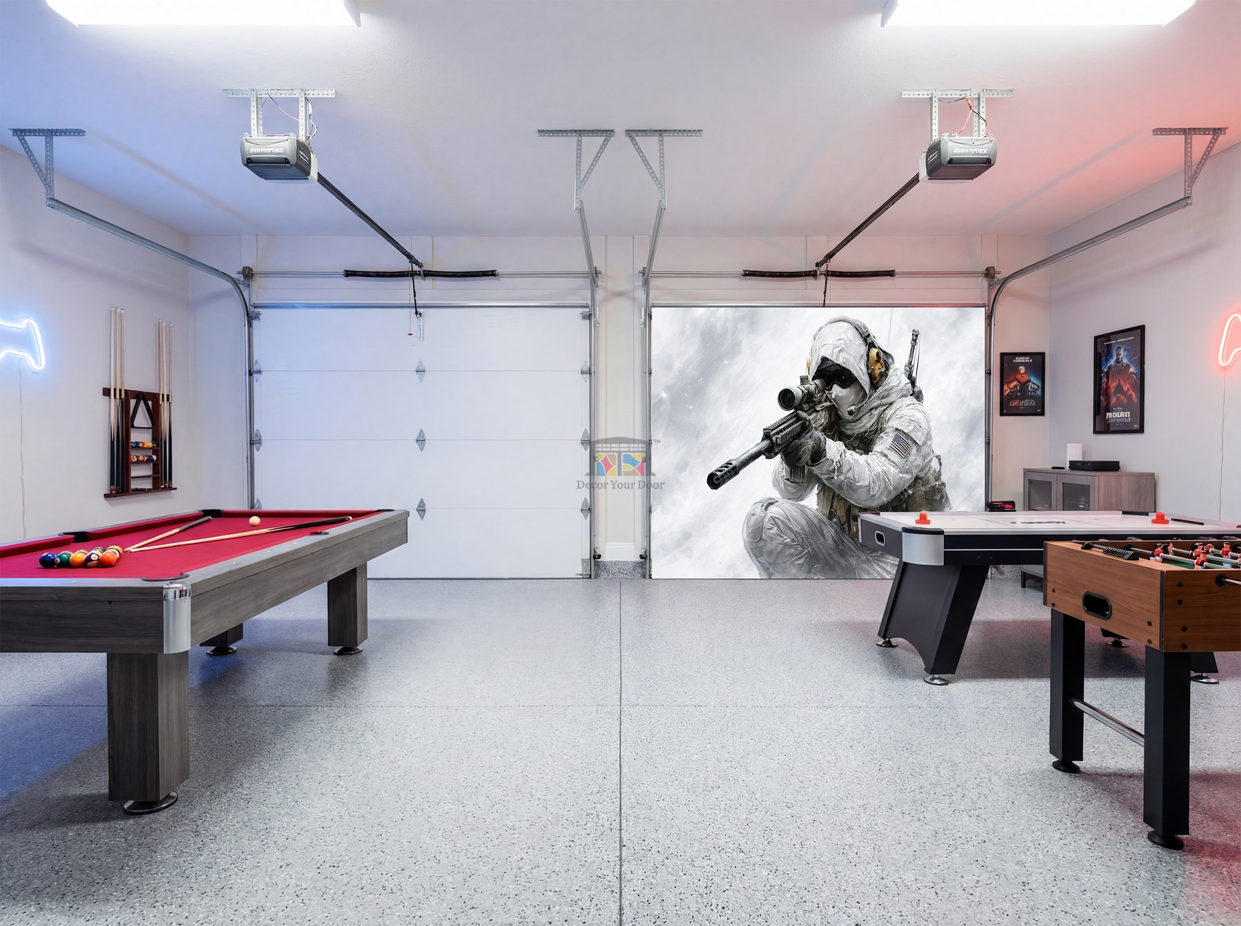 The Arctic Marksman design delivers a clean, high-impact tactical look with icy tones, sharp details, and a powerful futuristic soldier aesthetic. Printed in ultra-high resolution on premium fabric, this cover instantly levels up your gaming space without overwhelming the room. Perfect for gamers, teens, and adults who want a bold setup that still looks clean and modern. Designed by Decor Your Door to transform your garage into the ultimate game room experience.