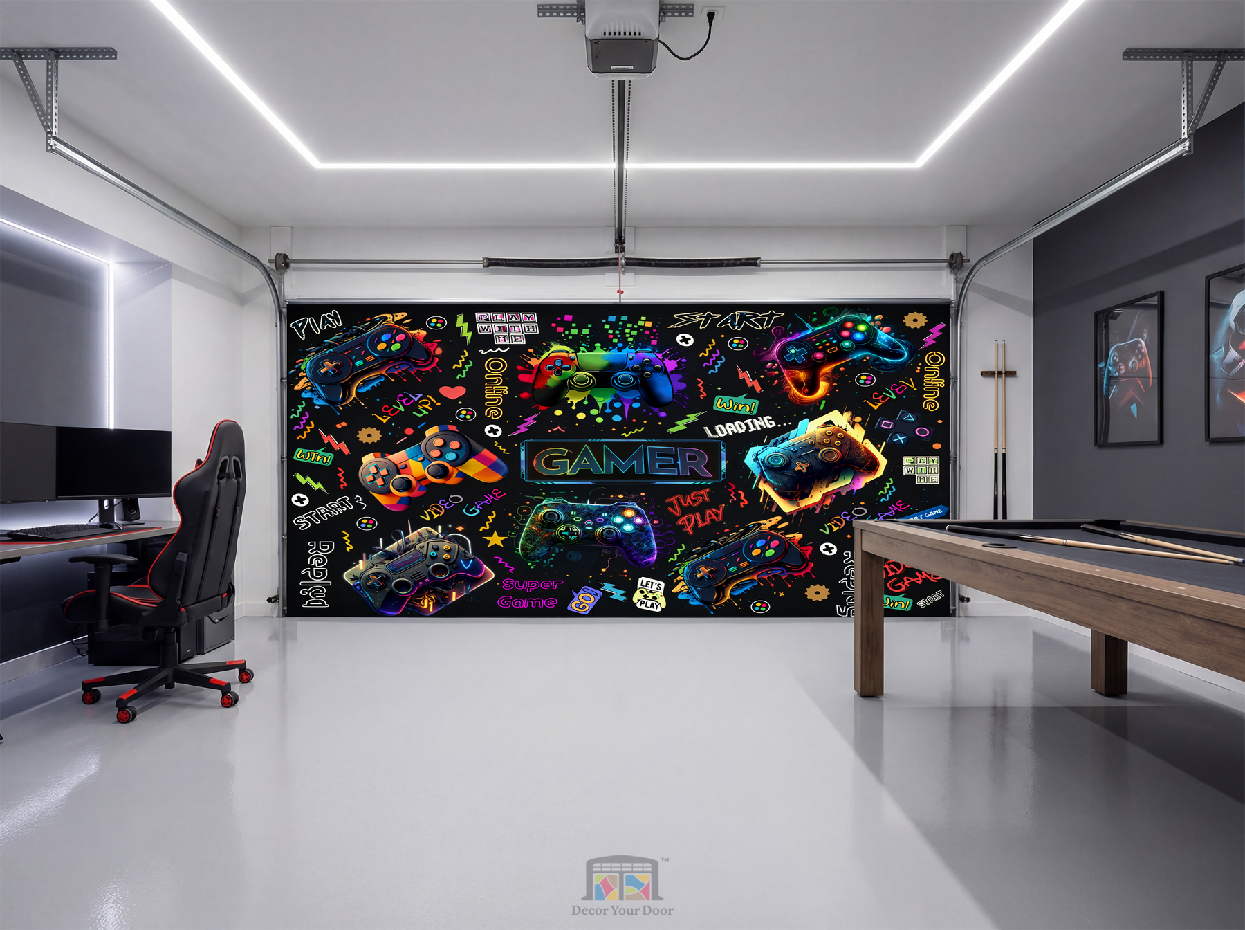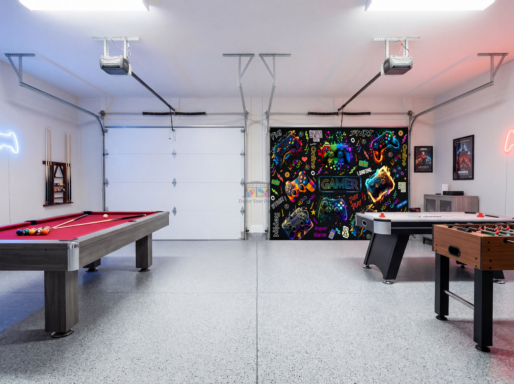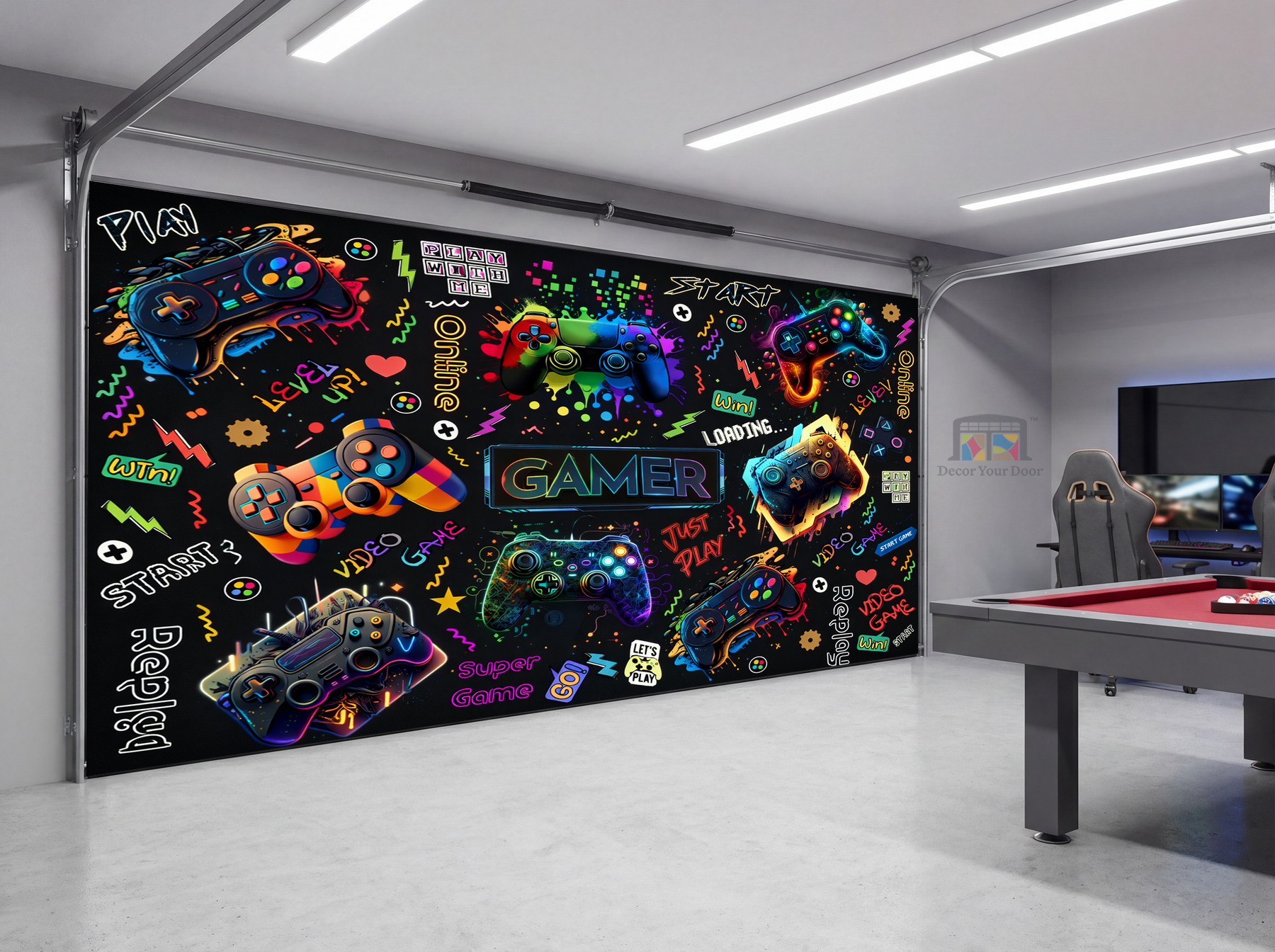 Bring instant energy and color to your game room with the Neon Gamer Collage by Decor Your Door. This bold, high-impact design features vibrant controllers, neon graphics, and playful gaming elements that turn your garage into a fun, modern gaming space for all ages.