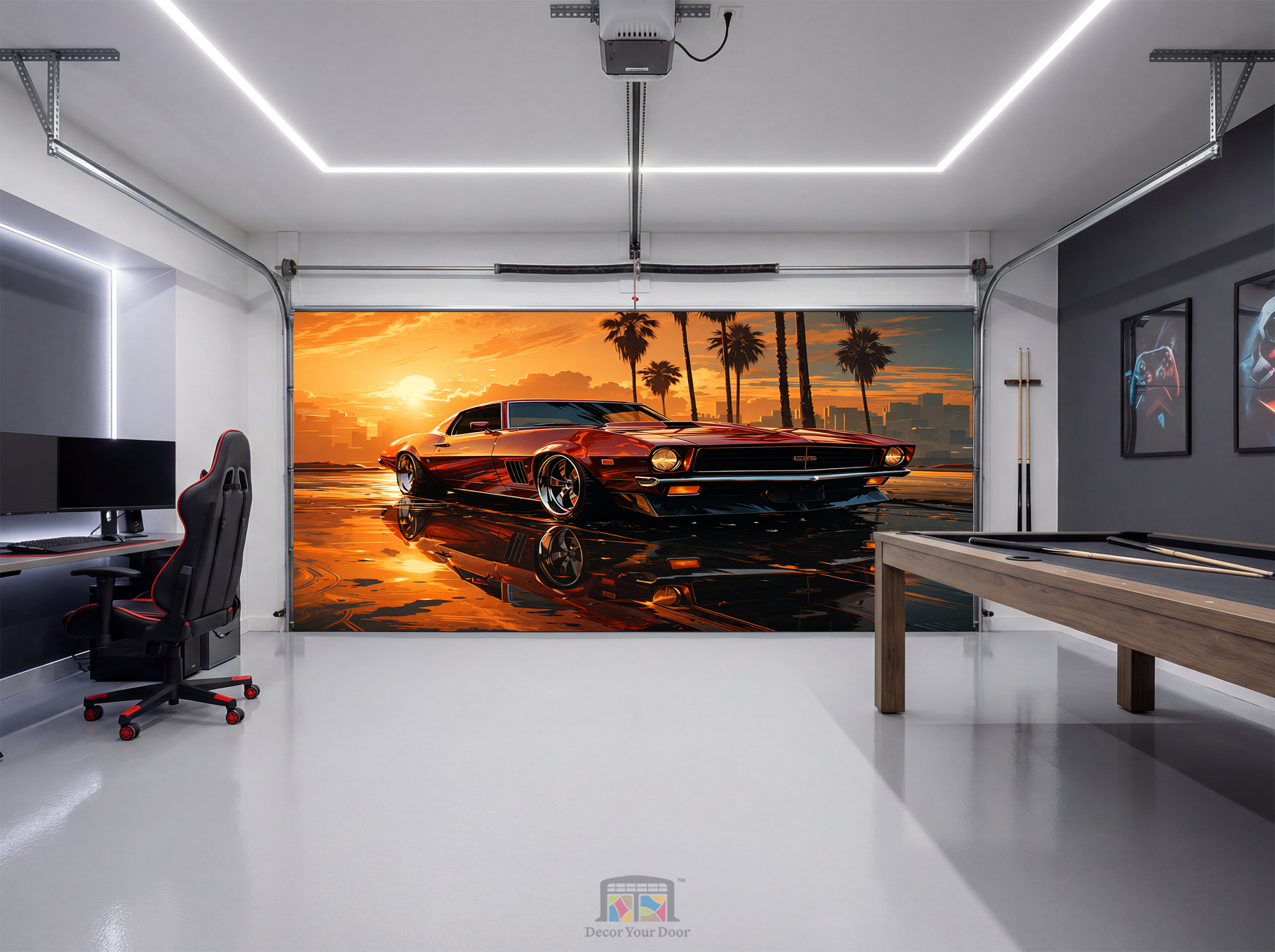 Bring classic muscle power and modern style into your game room with Sunset Muscle Legend. This cinematic design features a sleek American muscle car glowing under a golden sunset, with palm trees and city vibes that instantly elevate the space.
