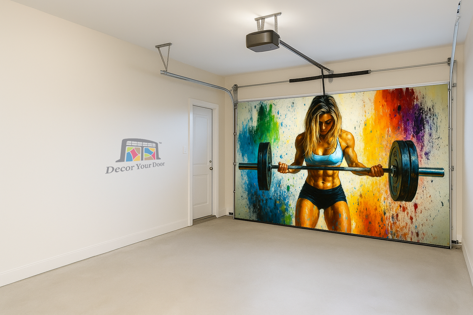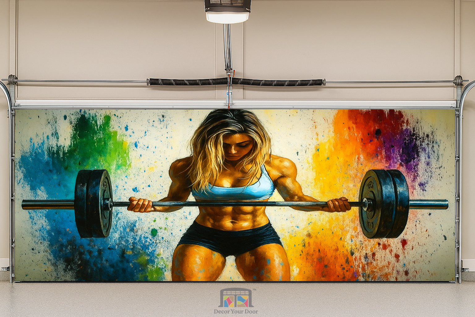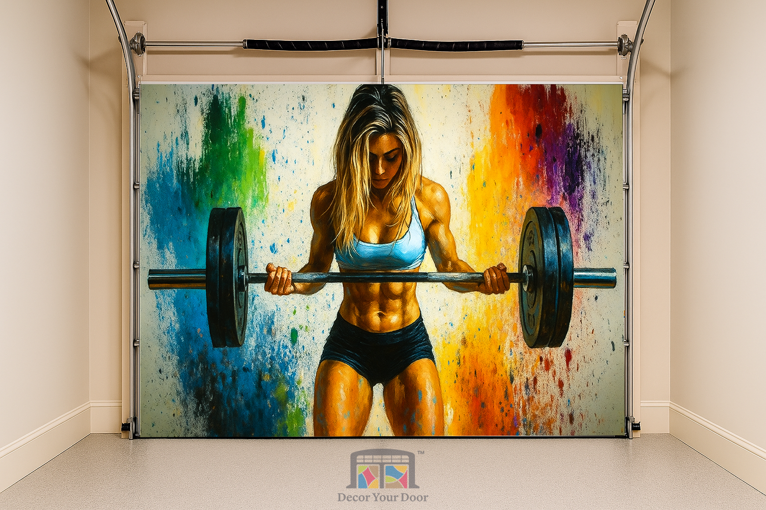 Ignite your gym space with Color Burst Strength by Decor Your Door. This energizing design features a focused female athlete lifting a heavy barbell, her sculpted physique highlighted with dynamic lighting and rich artistic texture. Behind her, explosive splashes of blue, green, yellow, orange, and red create a vibrant backdrop that symbolizes power, confidence, and unstoppable drive. Printed in ultra-high resolution on durable, weatherproof material, this cover transforms your garage into a bold motivational zone that pushes you to train harder and stay committed every day.